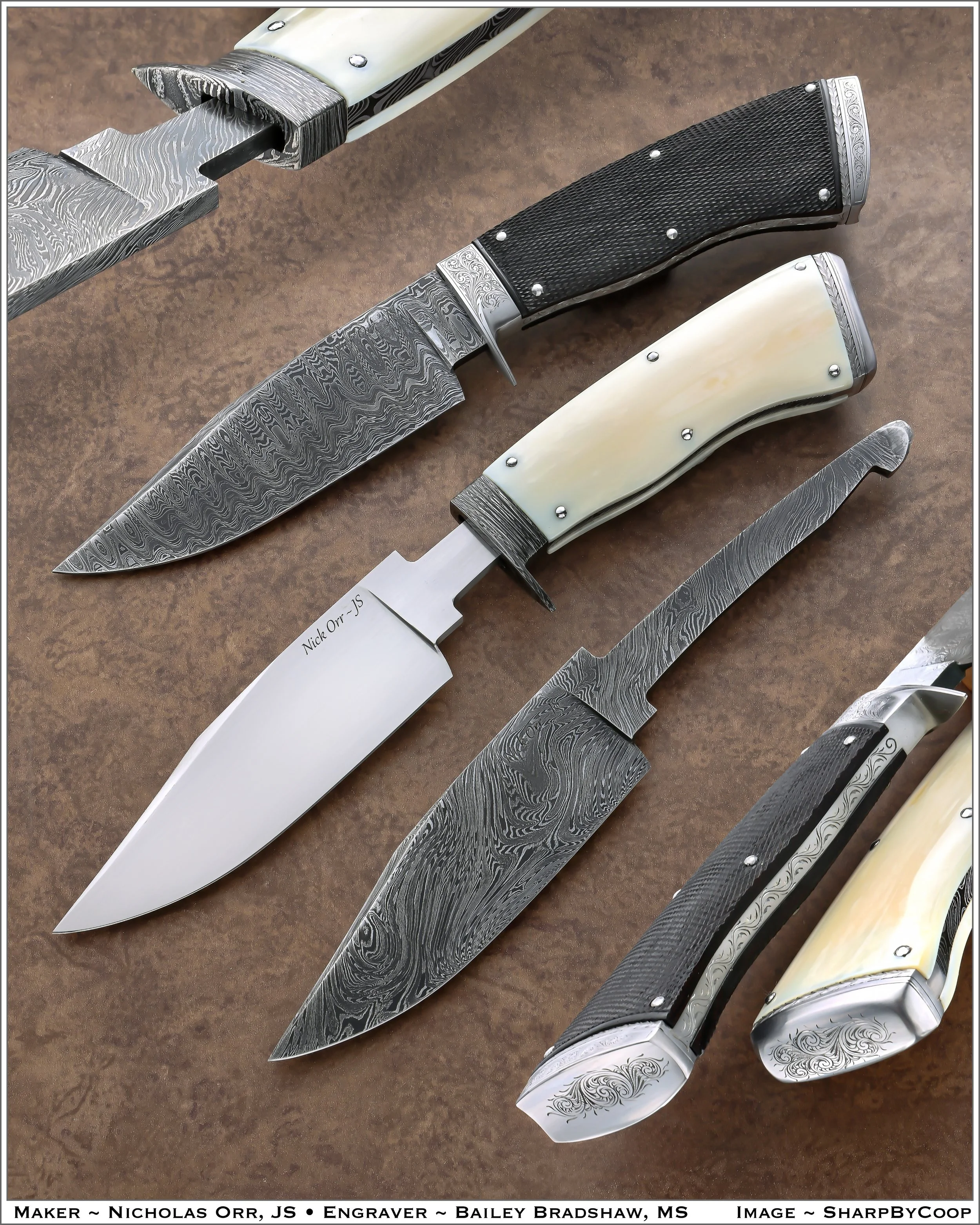 Damascus frame handled fighter with a half feather damascus blade, damascus guard, and camel bone handle scales with stainless pins.